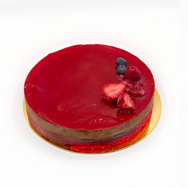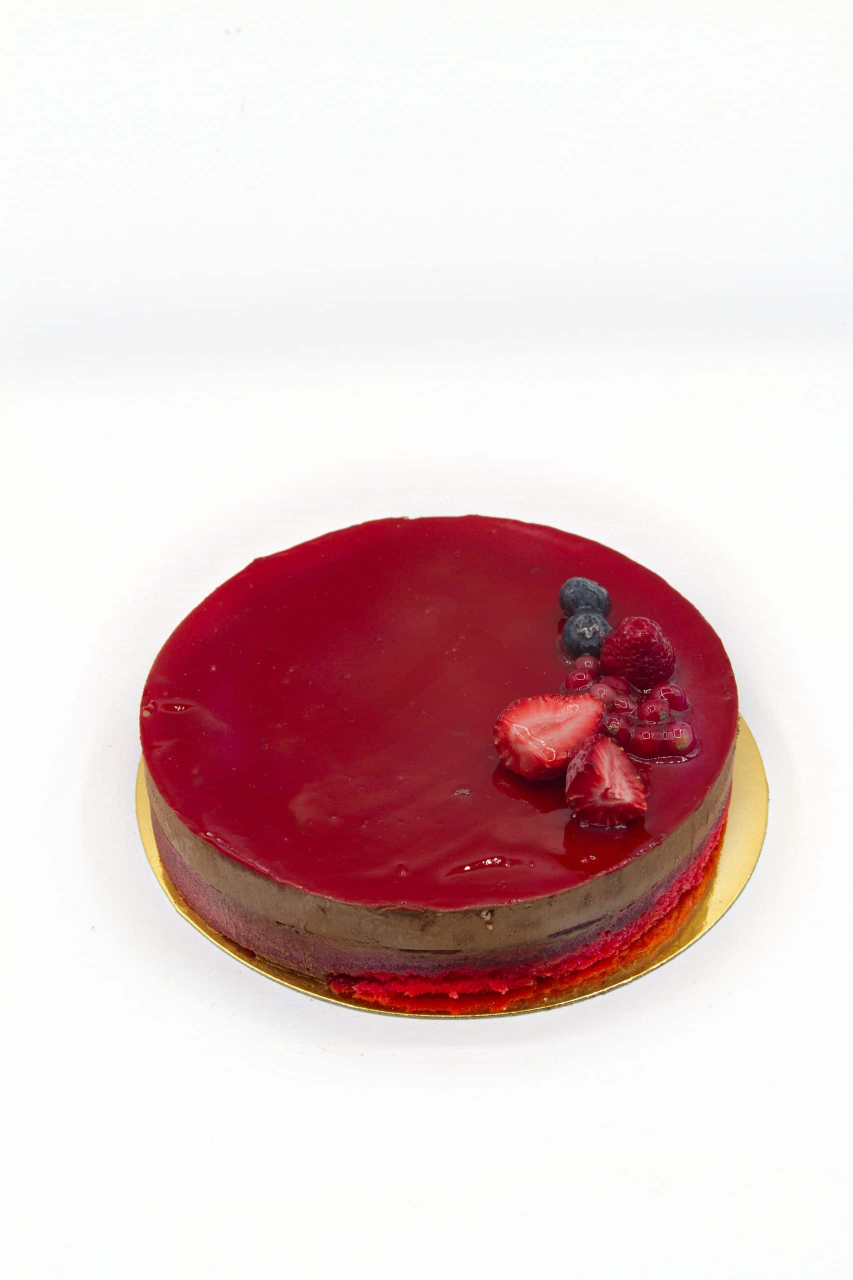 Ligera mousse de chocolate y frambuesa, montada sobre un fino bizcocho Red Velvet.
