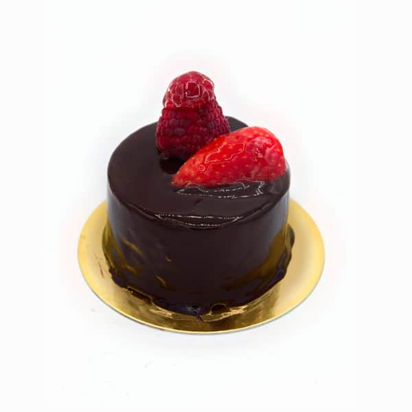 Fina base de bizcocho y capas de mousse de chocolate blanco y negro y su interior, recubierta en una brillante cobertura de chocolate.