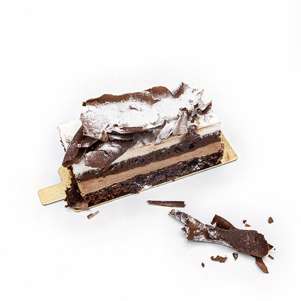 Bizcocho de cacao con virutas de chocolate por encima, en el interior dos deliciosas capas de trufa y nata.
